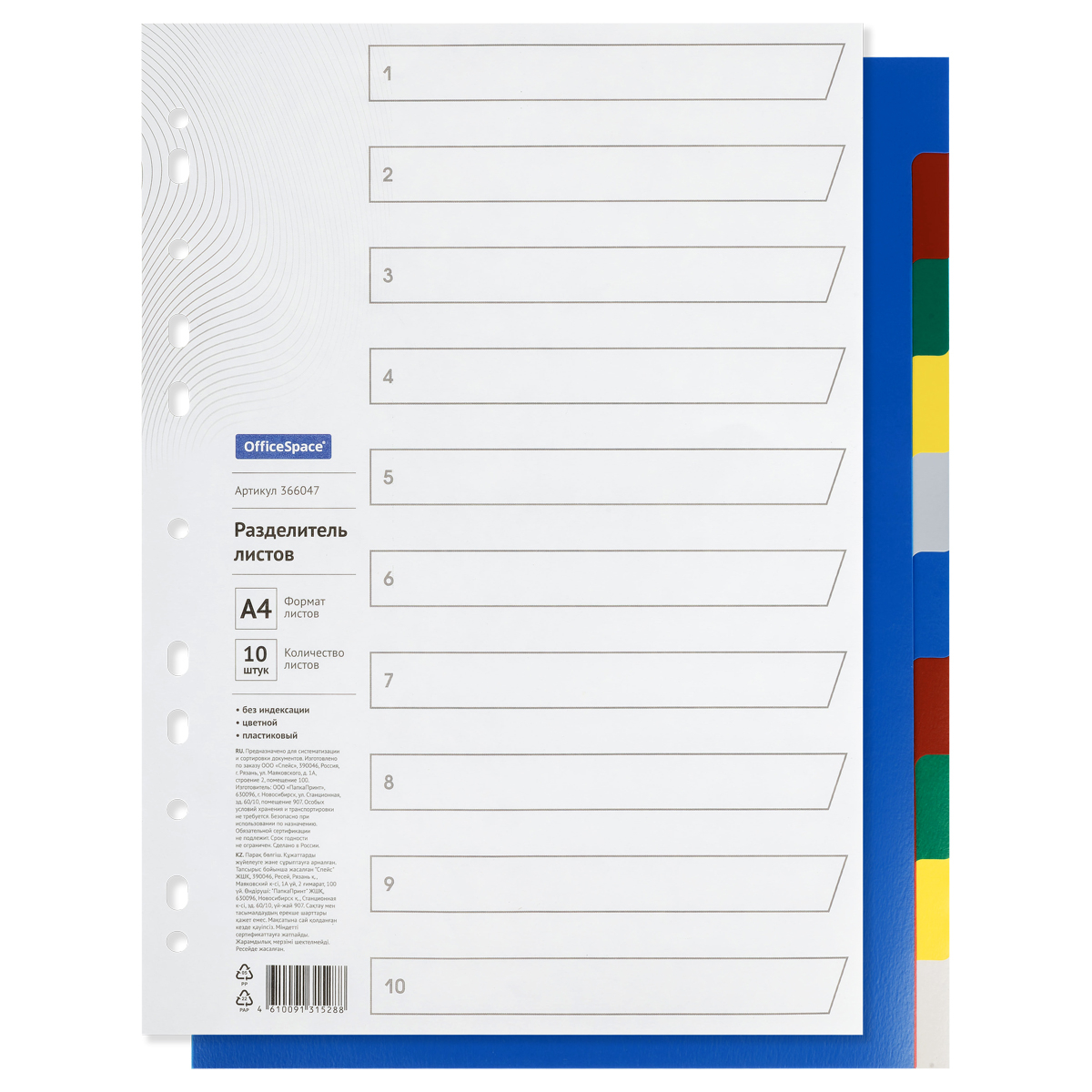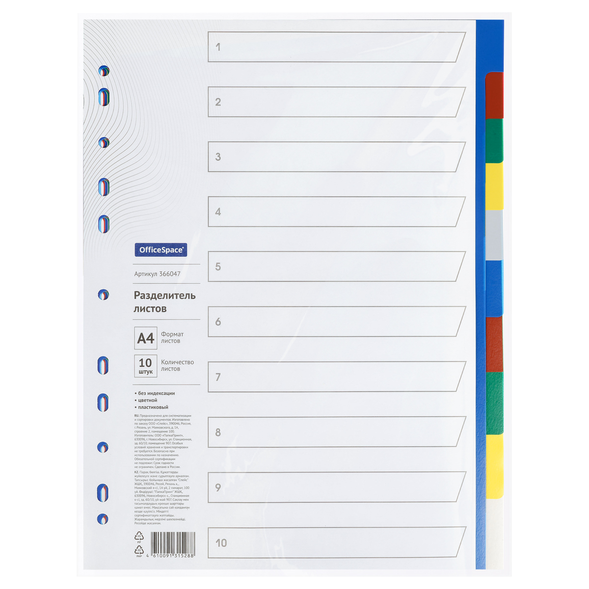 Разделитель листов OfficeSpace цветовой, А4, 10л. пластик (366047)