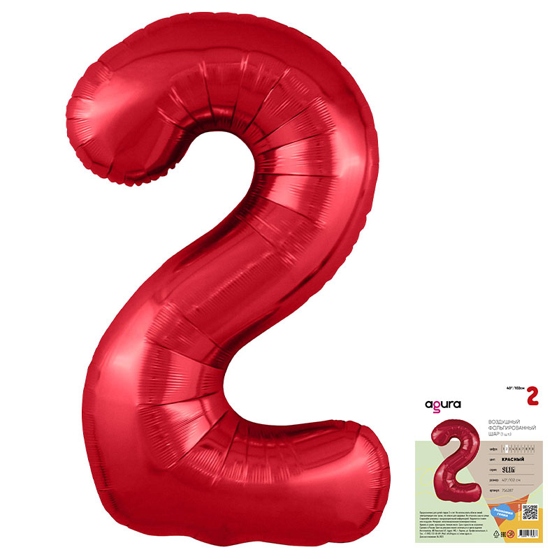 —Цифра надувная "2 Красный Slim" 102см, фольгированная (756287)