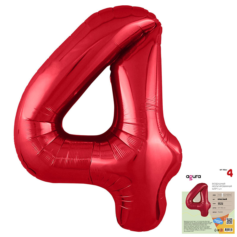 —Цифра надувная "4 Красный Slim" 102см, фольгированная (756300)