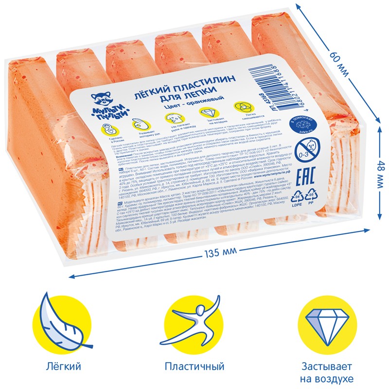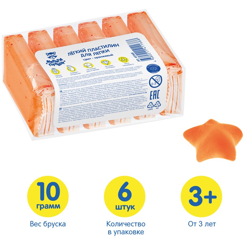 —Пластилин легкий Мульти-Пульти оранжевый, 6 шт (ЛП_43168)