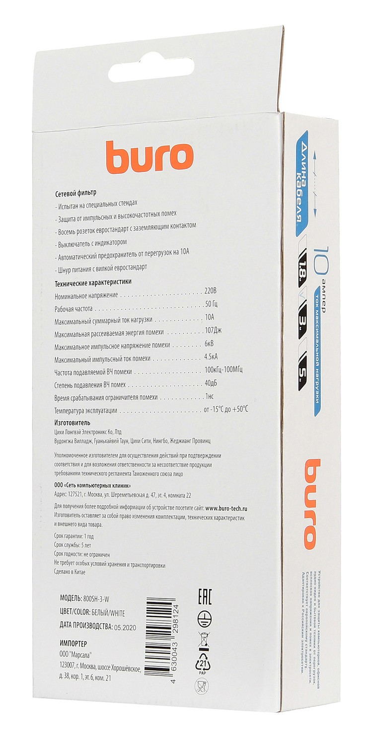 —Сетевой фильтр 3.0м, 8 розеток Buro, 800SH-3-W , 10А, 2200Вт, с выключателем, белый, коробка
